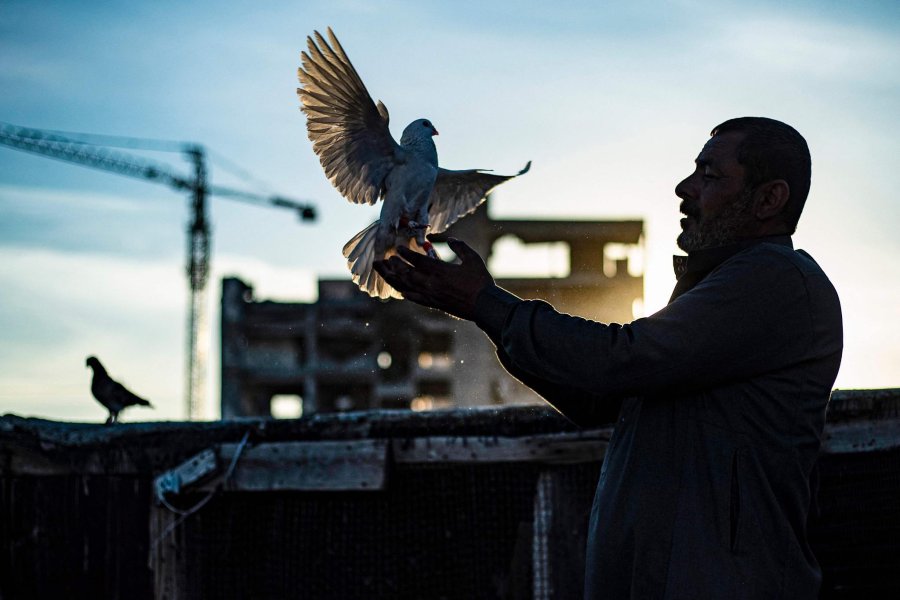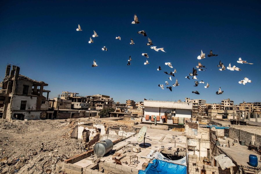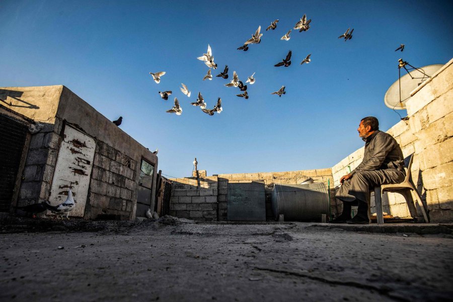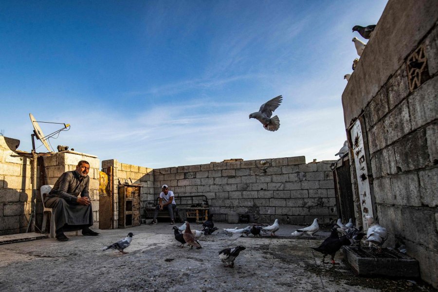 3月13日,叙利亚养鸽人阿卜杜勒-哈米德·哈纳在位于拉卡的家中屋顶放飞鸽子