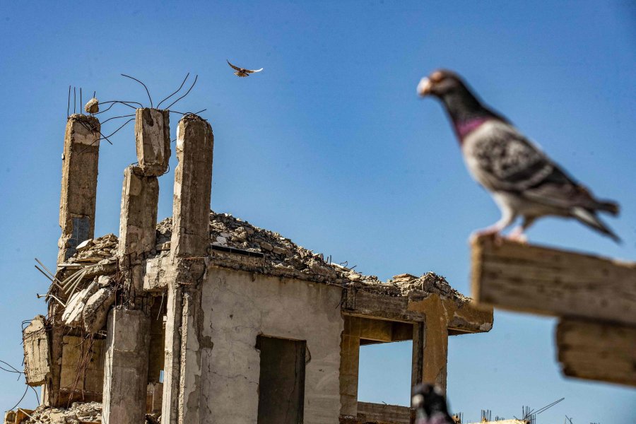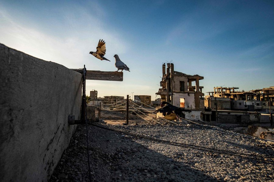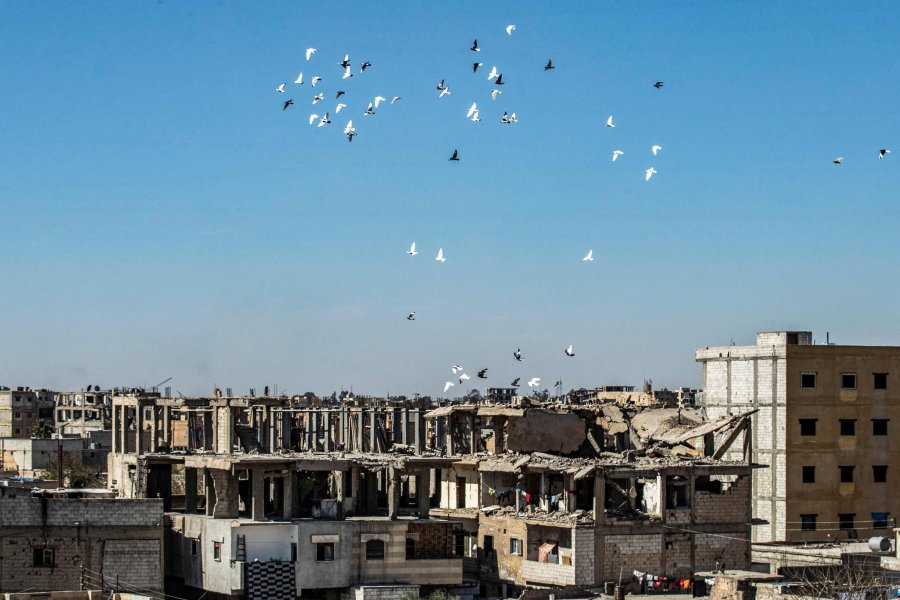 3月13日,鸽子飞翔在叙利亚拉卡的受损建筑之上
