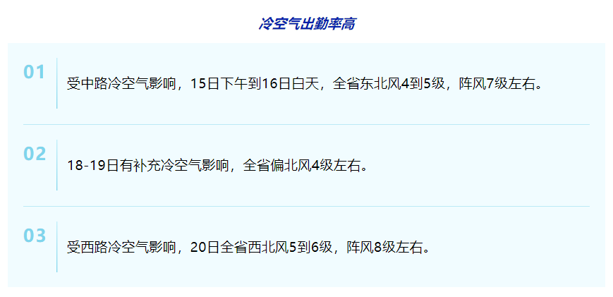 全省偏南风2到3级,15日中午自北向南转东北风4到5级,阵风7级左右。