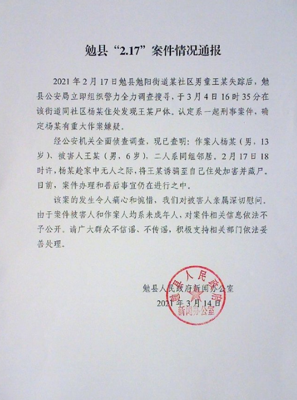 6岁男童被害,官方:其13岁同组邻居确有重大嫌疑