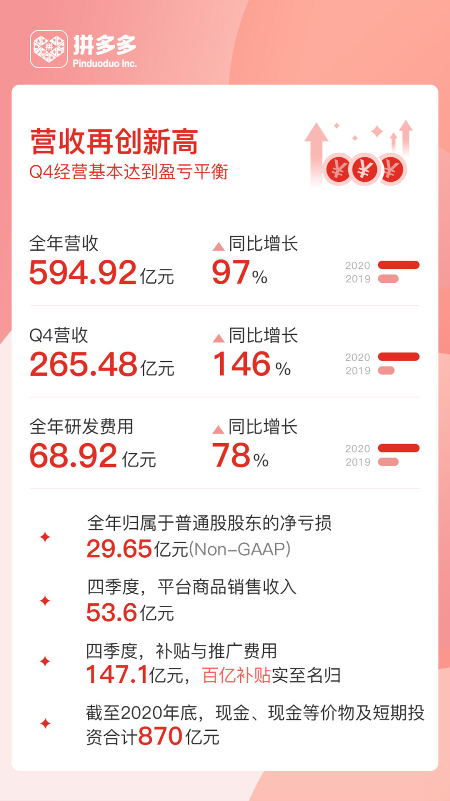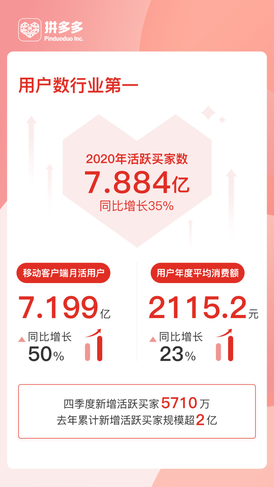 3月17日,拼多多发布2020年第四季度及全年财报。截至2020年底,拼多多年活跃买家数达7.884亿。平台四季度新增5710万活跃买家,去年累计新增活跃买家规模超2亿。