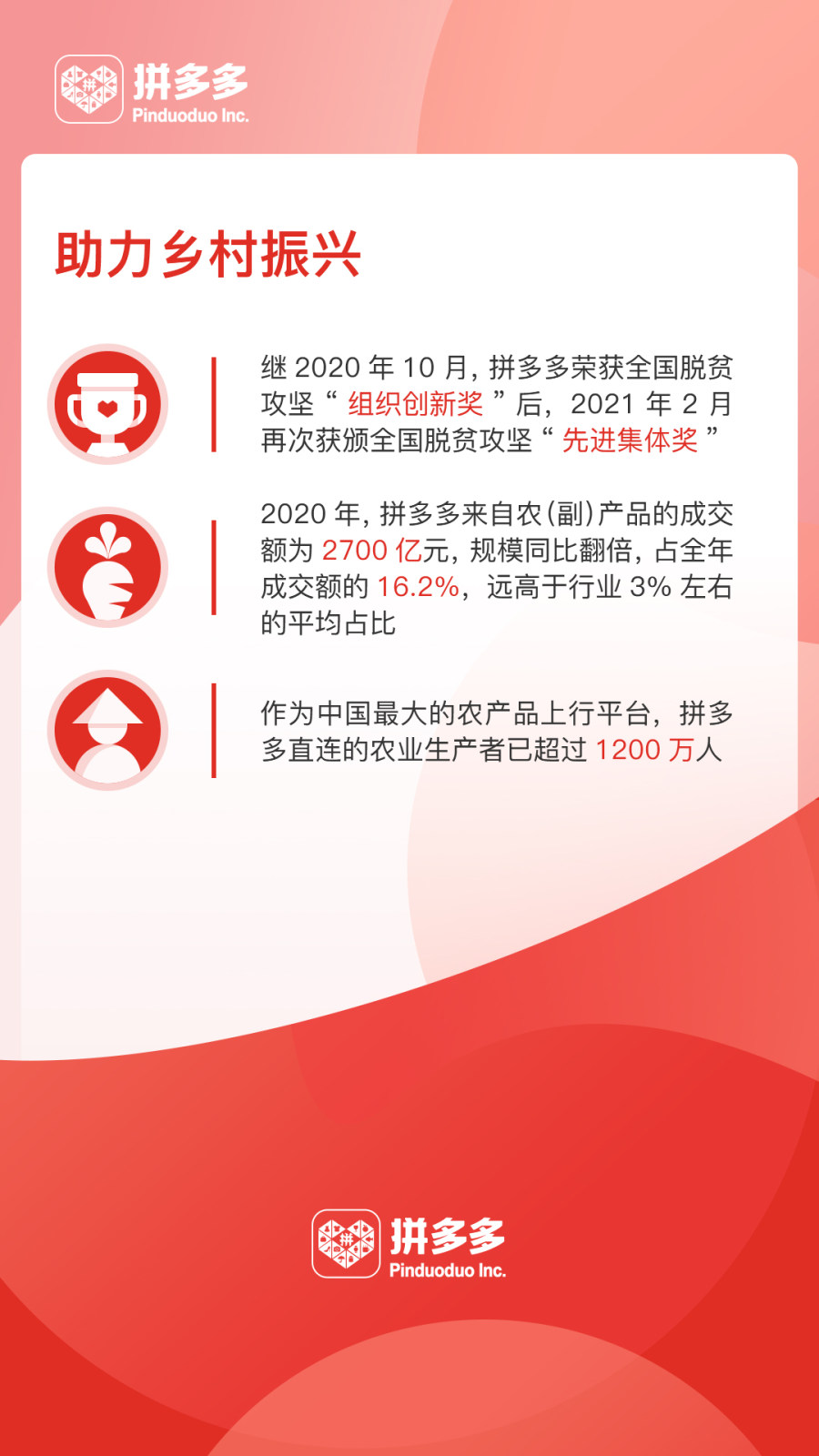 公布财报的同时,拼多多董事长黄峥发布2021年度致股东信,宣布董事会已批准其辞任董事长,由联合创始人、现任CEO陈磊接棒。黄峥在致股东信中称,行业竞争的日益激烈甚至异化,让其意识到传统的以规模和效率为主要导向的竞争有其不可避免的问题,要改变就必须在核心科技和其基础理论上寻找答案。黄峥表示,辞任董事长后,自己将更多结合个人终身兴趣,致力于食品科学和生命科学领域的研究。