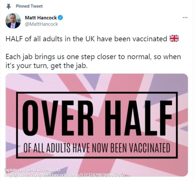 (原标题《英国卫生大臣:英国一半成年人已接种新冠疫苗》)