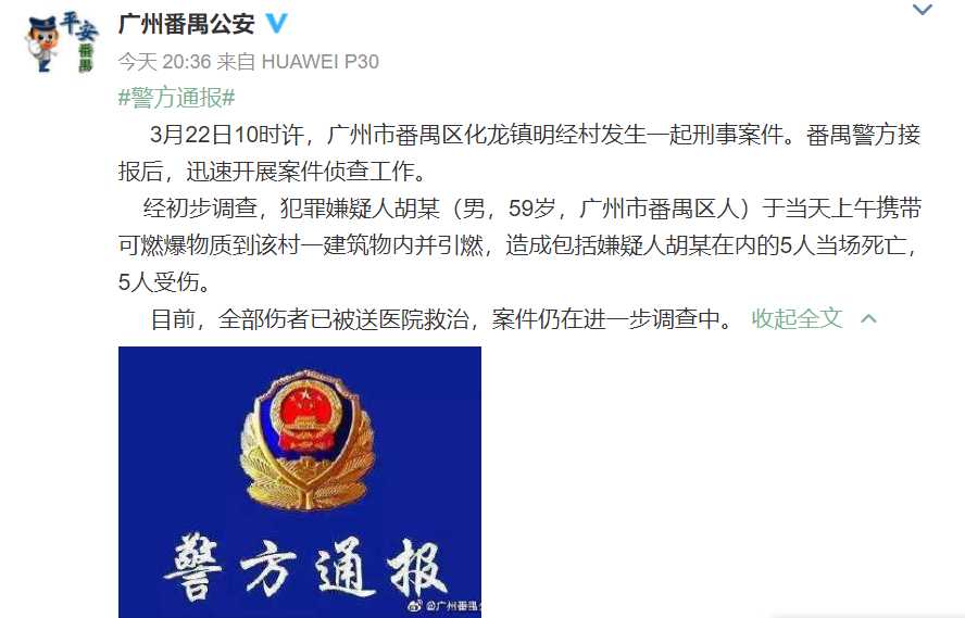 广州番禺一男子引燃可燃爆物质,造成5死5伤