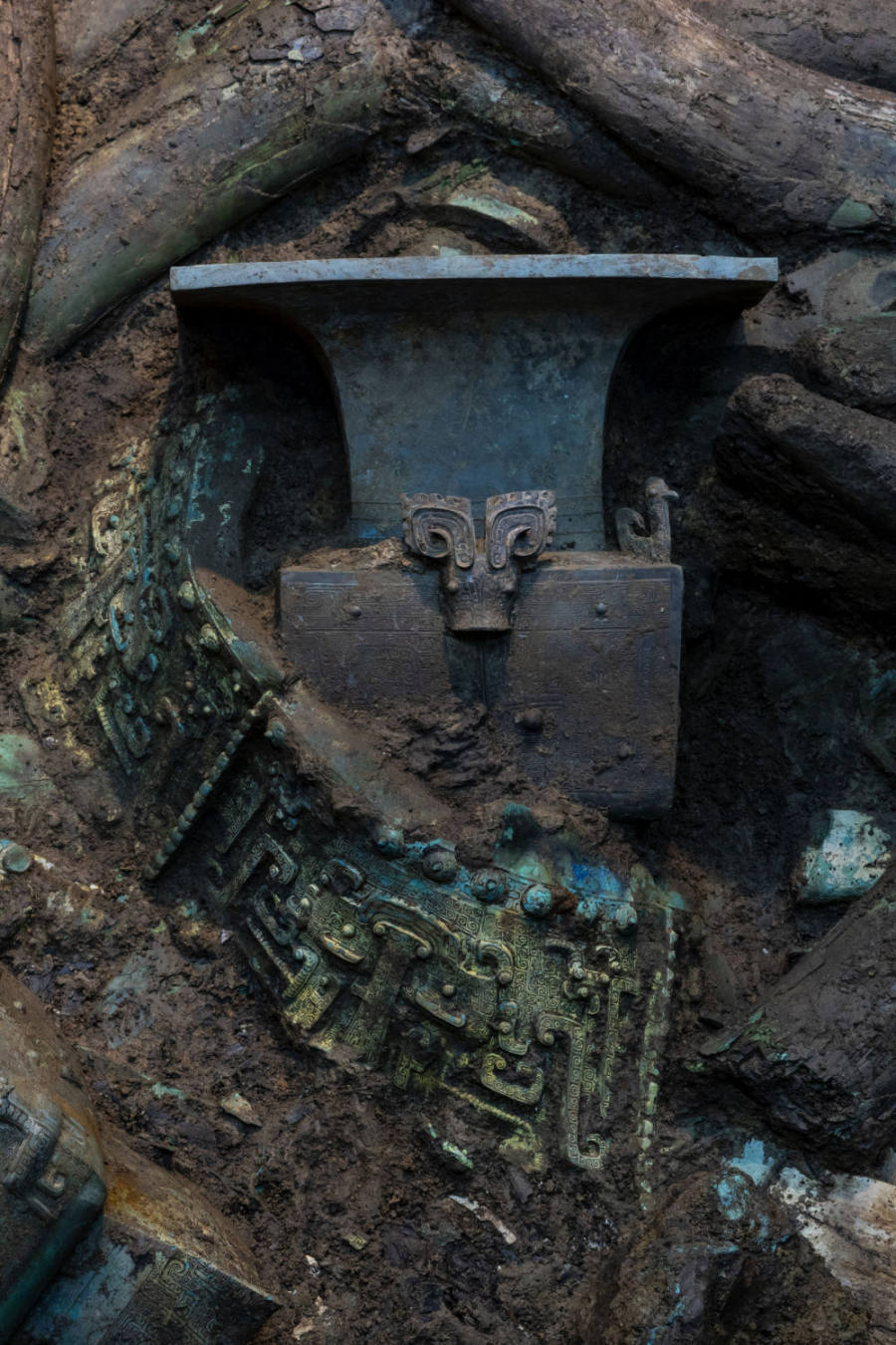 3号“祭祀坑”青铜器上的精美纹饰。(新华社记者沈伯韩摄)