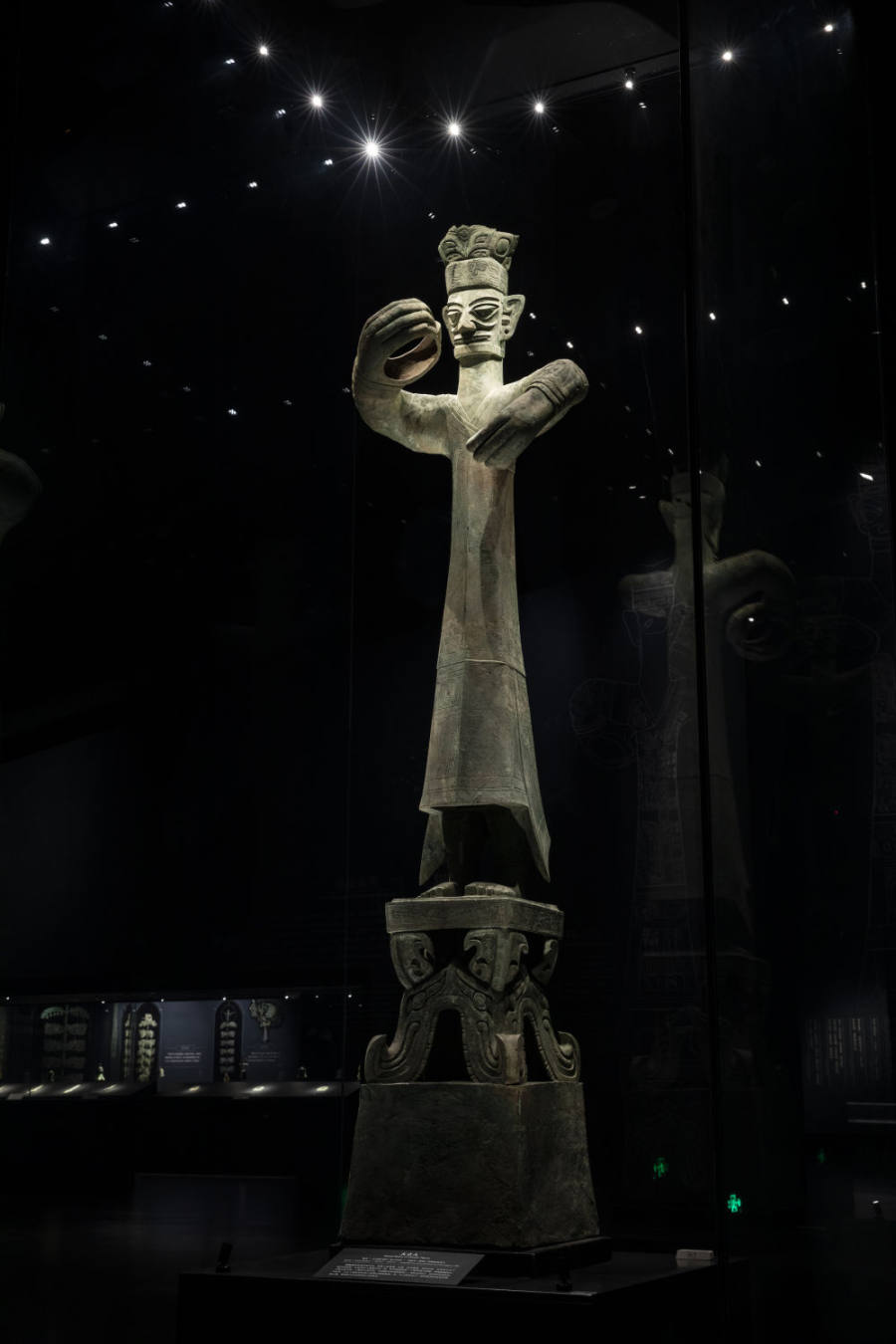 1986年2号“祭祀坑”出土的“青铜大立人”人像高达一米八,加上基座通高约两米六,被称为“东方巨人”。