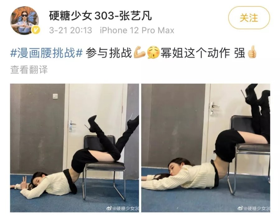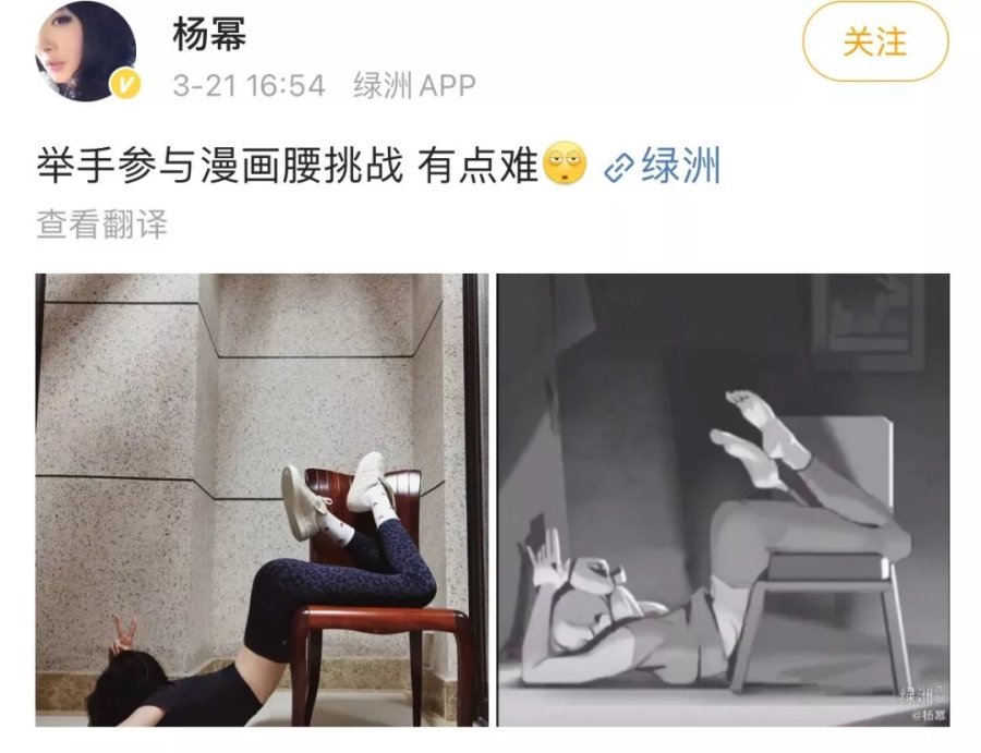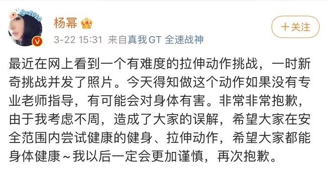 3月22日下午,发起挑战的杨幂在微博上道歉,“由于我考虑不周,造成了大家的误解,希望大家在安全范围内尝试健康的健身、拉伸动作……”
