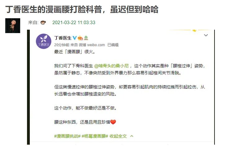 3月22日,健康科普网站“丁香医生”的官博援引骨科医生孙悦礼( 微博@啃骨头的桑小尼) 的说法,指出“漫画腰”其实是一种“腰椎过伸”姿势,“虽然属于静态,不像突然受到外界暴力那么容易引起椎间关节滑脱,但却更容易引起肌肉的持续拉拽而引起拉伤,从长远看也会增加腰椎退变的风险”。