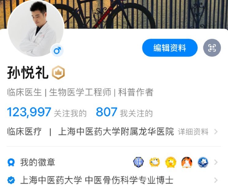 孙悦礼医生的知乎认证为临床医生,上海中医药大学中医骨伤科学专业博士。