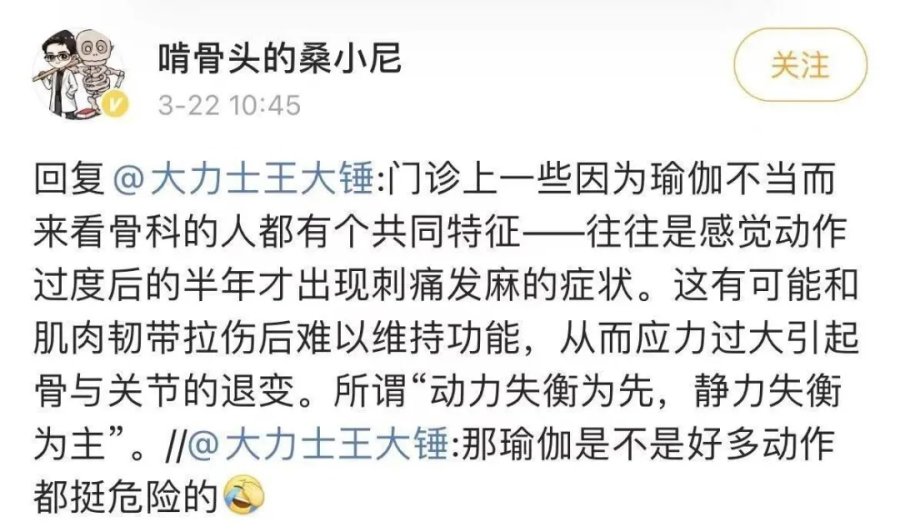 对此,孙医生表示:门诊上一些因为瑜伽不当而来看骨科的人都有个共同特征——往往是感觉动作过度后的半年才出现刺痛发麻的症状。这有可能和肌肉韧带拉伤后难以维持功能,从而应力过大引起骨与关节的退变。