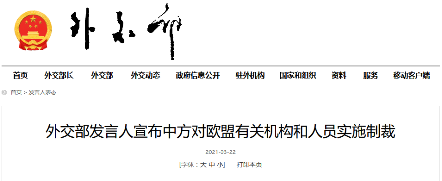 3月22日,欧盟以所谓新疆人权问题为借口,对中国四名官员和一个实体实施单边制裁。对此,中方立刻做出反制,对欧方严重损害中方主权和利益、恶意传播谎言和虚假信息的10名人员和4个实体实施制裁。