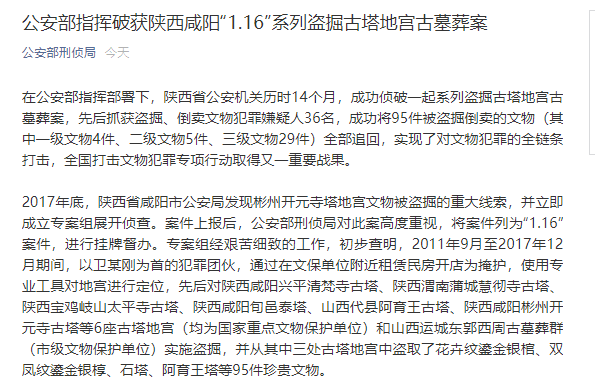 据公安部刑侦局微信公号22日消息,在公安部指挥部署下,陕西省公安机关历时14个月,成功侦破一起系列盗掘古塔地宫古墓葬案,先后抓获盗掘、倒卖文物犯罪嫌疑人36名,成功将95件被盗掘倒卖的文物(其中一级文物4件、二级文物5件、三级文物29件)全部追回,实现了对文物犯罪的全链条打击,全国打击文物犯罪专项行动取得又一重要战果。
