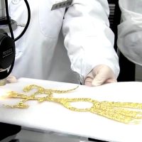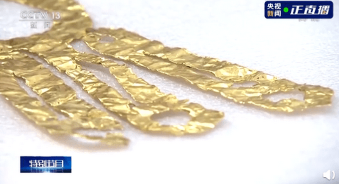 “这么薄的金器,一般不会单独使用,它有可能是敷贴在什么器物上作为装饰或者沿边镶嵌在里面。这个还有待新的研究。” 原中国国家博物馆研究员马燕如认为,这件金器有很多镂空的部分,主要采用的应该是脱錾或者剪切的方式来成型。“这种脱錾镂空的工艺一直延续到现在,人们还在用。”