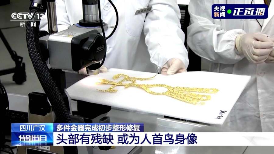 22日,三星堆遗址考古发掘提取一批精美金器,首次发现的精美鸟形金饰片正式亮相。