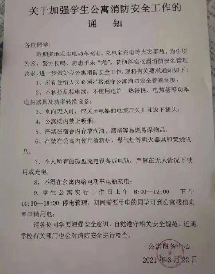 3月22日,山西大学发布的《关于加强学生公寓消防安全工作的通知》(以下简称《通知》)在网络流传并引发关注。《通知》显示,山西大学学生公寓工作日上午8:00-12;00,下午14:30-18:00实行停电管理,期间需要用电的同学需要到公寓楼值班室申请用电。