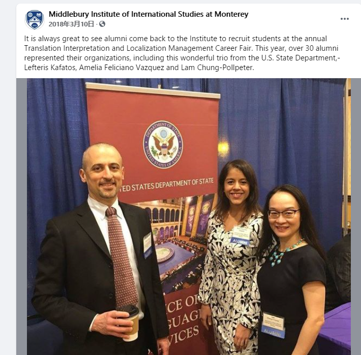 ▲Lam(右一)作为校友出席美国蒙特雷高级翻译学院活动。图据脸书