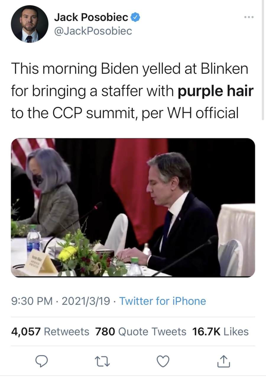 美国网友称,中美高层战略对话这种级别的会谈,美国却带着一位染着紫色头发的女性出席,这“让情况糟了百倍”⋯⋯