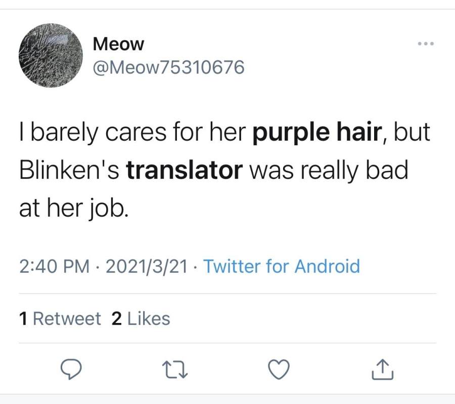 与此同时,也有网友称,“根本不在意她的紫发,但布林肯的这个翻译工作做得实在太烂了。”