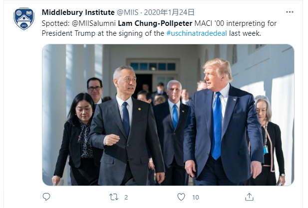据环球时报报道,2020年1月15日,时任美国总统特朗普在白宫椭圆形办公室会见中共中央政治局委员、国务院副总理、中美全面经济对话中方牵头人刘鹤,双方共同出席中美第一阶段经贸协议签署仪式。蒙特雷高级翻译学院社交媒体账号发布的现场图片显示,Lam依然作为特朗普的翻译,不过那时她就已经染了发。
