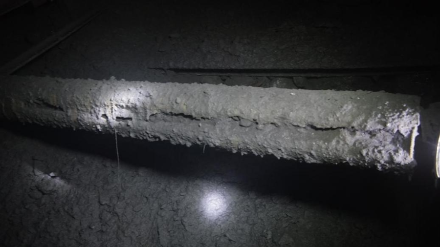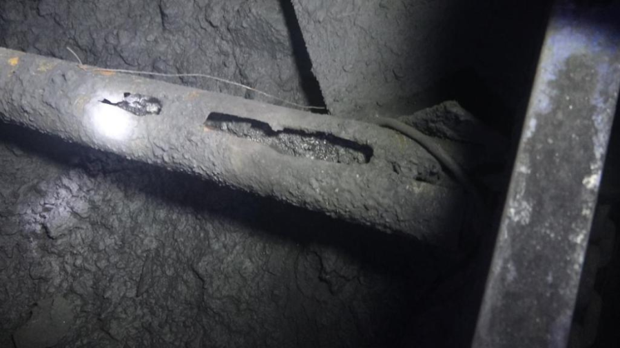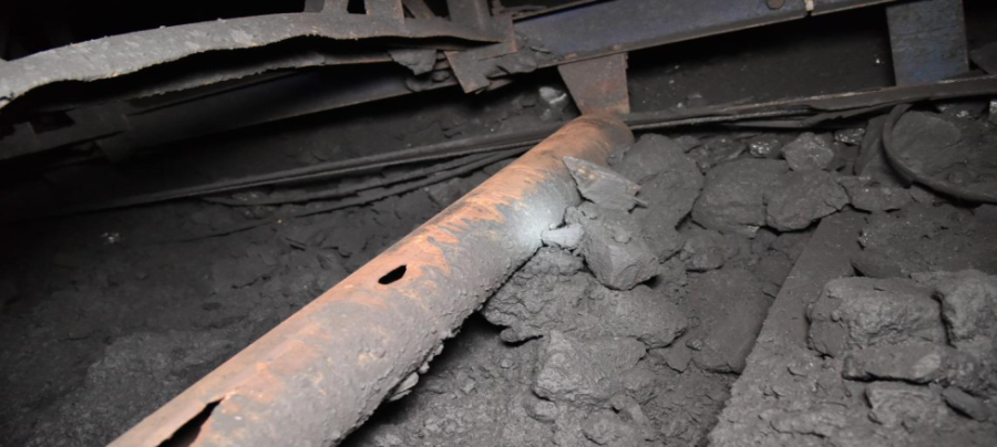 2.二号大倾角胶带、控制硐室、+100m转运胶带巷及+5m给煤机烧毁情况。机头硐室处胶带燃烧只剩下钢丝绳,胶带烧完(钢丝裸露、断开);+5m联络巷上方18m处胶带接头断开,胶带烧完(钢丝裸露、断开);主动滚筒包覆层炭化,胶带机头硐室机油桶完好,大倾角胶带巷线缆表面橡套烧失,露出铠装层,洒水装置烧毁;+100m转运胶带巷胶带烧毁100余m,仅见胶带钢架。