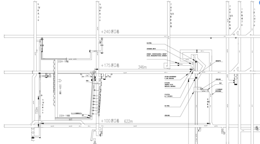 4.事故区域管线及CO传感器烧毁情况。+175mN1#石门处电缆线盒烧毁;2324-1采煤工作面进风安装有风速风向传感器、高低浓度甲烷传感器、一氧化碳传感器,传感器因工作面停电而停止运行,未见损坏;二号大倾角胶带巷与+5m主要进风巷交叉口烟熏痕迹明显,监控线缆燃烧炭化痕迹明显。