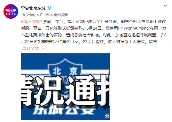 崇尚、学习、捍卫英烈已成为全社会共识,却有个别人在网络上通过嘲讽、歪曲、丑化等形式诋毁英烈。北青-北京头条记者3月26日从北京市公安局东城分局获悉,3月24日,微博用户“YvonnAlmond”在网上发布丑化英雄烈士的言论,造成恶劣社会影响。