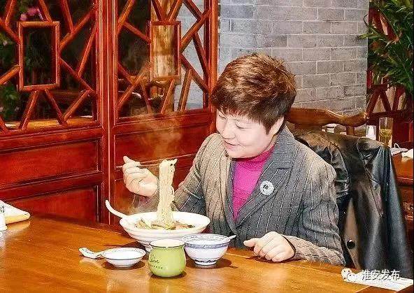 蔡丽新品尝长鱼面 图源:淮安发布