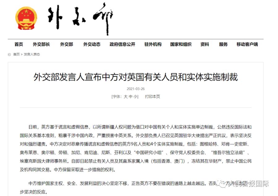 “人民日报国际”微信公号3月26日消息,当日,有一则重磅消息:我外交部宣布,对英方9名人员和4个实体实施制裁。
