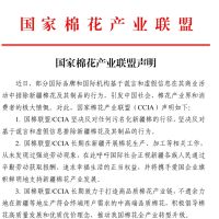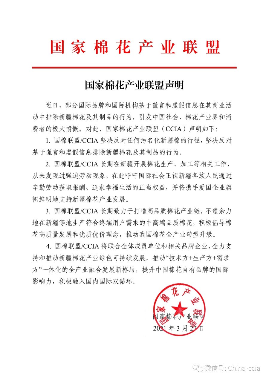 3月27日,国家棉花产业联盟发布声明:国棉联盟/CCIA坚决反对污名化新疆棉行径;国棉联盟/CCIA长期在新疆开展棉花生产、加工等相关工作,从未发现过强迫劳动现象;将联合全体成员单位和相关品牌企业,全力支持和推动新疆棉花产业绿色可持续发展,提升中国棉花自有品牌的国际影响力。
