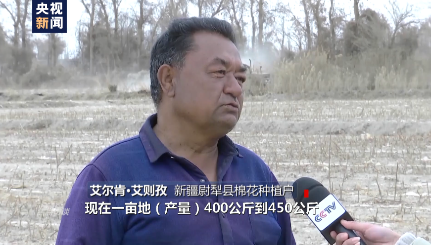 尉犁县棉花种植户 艾尔肯·艾则孜:现在一亩地(产量)400公斤到450公斤,多劳动多挣钱就是,现在(养了)七八十个羊,二十个牛,现在羊圈里面,生活好得很现在。