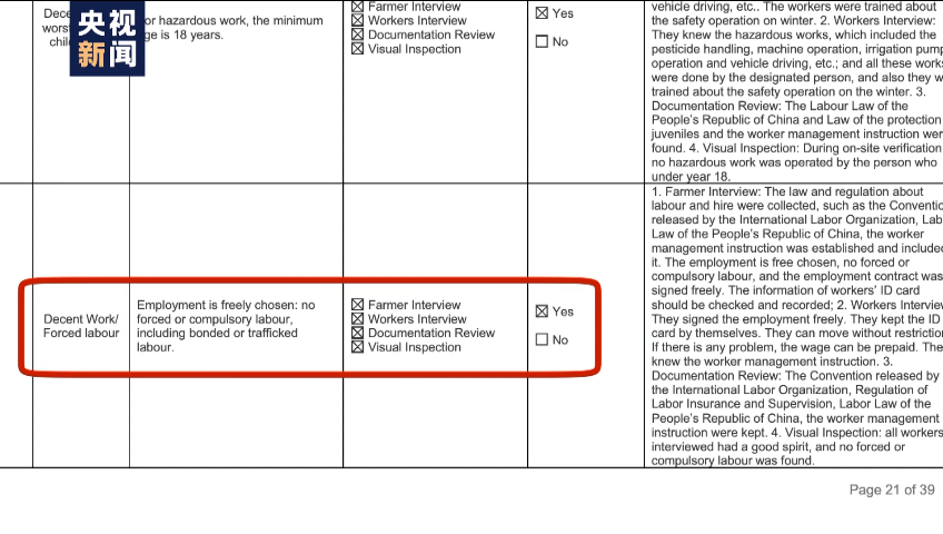 瑞士良好棉花发展协会上海代表处首席代表 吴艳:首先是生产者单位进行一个自我评估,然后由我们上海的团队,他们进行第二方的可信度审核。那么最后是由第三方的审核机构出具一个单独的验证报告。为了回应境外有关“强迫劳动”的舆论,我们上海代表处对新疆的项目进行了严格的复查。