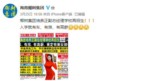 日前,海南椰树集团开启了2021年的招新,其发布的一则“培养正副总经理学校再招生”宣传引发关注。