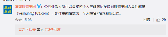 3月28日下午,海南椰树集团在这则微博内容评论区置顶了个人应聘简历的投递方式,也再次佐证这则招聘的真实性。