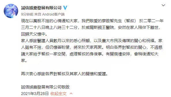 “现在以万般不捨的心情通知大家,我们敬爱的廖启智先生(智叔) 于二零二一年三月二十八日晚上八时三十二分,于威尔斯亲王医院,安然在家人陪伴下离世,回归天父怀中。家人感谢医护人员数月以来的悉心照顾,以及广大市民及传媒的关心和祝福。家人虽有不捨,但仍怀著盼望,将来于天家再聚。明白各界对智叔的关心,不过恳请大家给予智叔一家空间,处理智叔的身后事。有关丧礼安排,会稍后通知大家。再次衷心感谢各界对智叔及其家人的关怀和爱护。