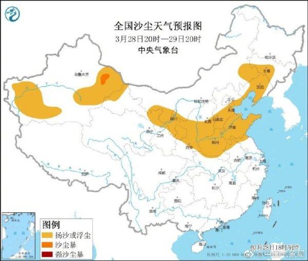 预计,3月28日20时至29日20时 ,内蒙古东南部、辽宁中西部、吉林南部、天津、河北中南部、山西南部、河南、山东、苏皖北部、新疆南疆盆地和东部、甘肃北部、宁夏、陕西中北部等地有扬沙或浮尘天气,其中,新疆东部局地有沙尘暴。