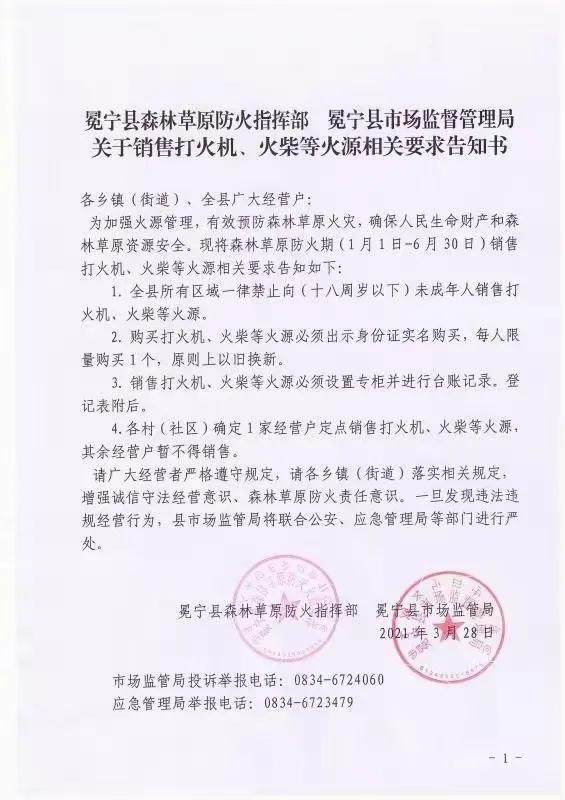 3月28日,四川冕宁县森林草原防灭火指挥部、冕宁县市场监督管理局联合发布“最严防火令”,明确要求在森林草原防火期(1月1日——6月30日)内,全县范围内一律禁止向未成年人销售打火机、火柴等火源;购买打火机、火柴等火源必须出示身份证实名购买,每人限量购买1个,原则上以旧换新。