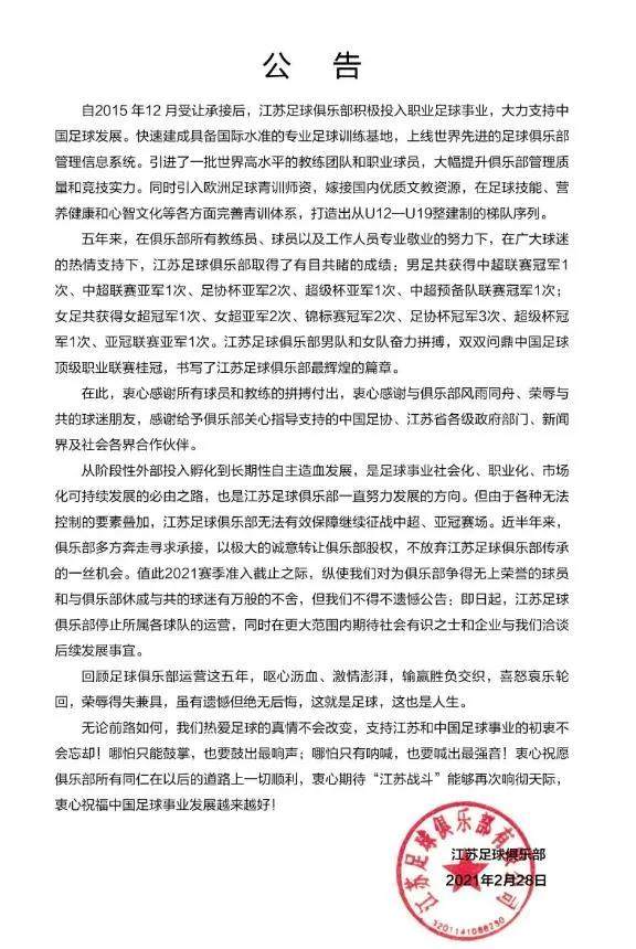 2月最后一天,江苏队发布停止运营公告。