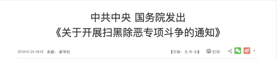 2018年1月,中共中央、国务院发出《关于开展扫黑除恶专项斗争的通知》。《通知》指出,党中央、国务院决定,在全国开展扫黑除恶专项斗争。