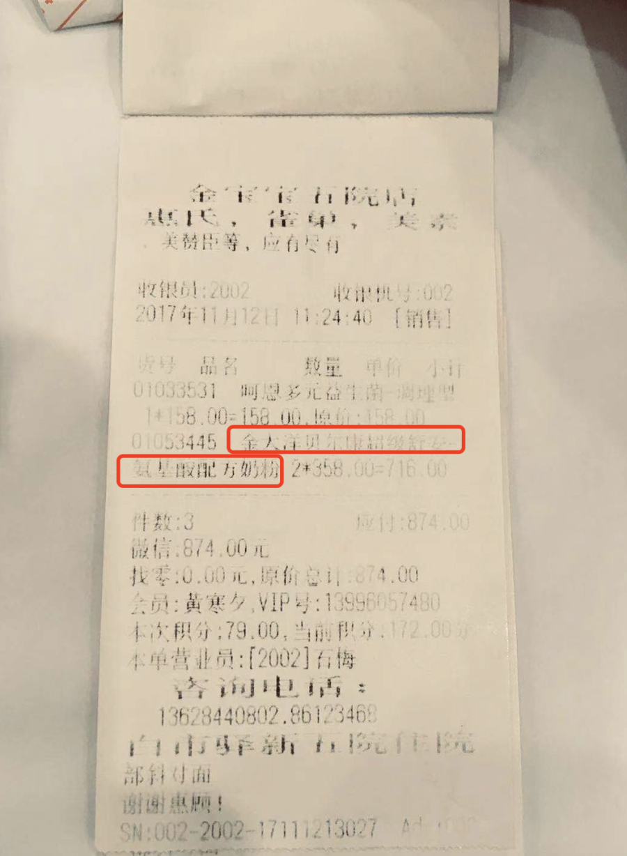 而在母婴店给黄先生的收据上,写明了“金大洋贝儿康”就是奶粉。