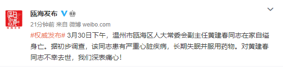 31日深夜,浙江省温州市瓯海区人民政府新闻办公室官方微博发布消息,3月30日下午,温州市瓯海区人大常委会副主任黄建春同志在家自缢身亡。据初步调查,该同志患有严重心脏疾病,长期失眠并服用药物。对黄建春同志不幸去世,我们深表痛心!