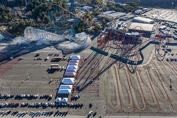 当地时间2021年2月4日,美国加利福尼亚州,六旗游乐场被改建为新冠疫苗临时接种点,市民开车前来接种新冠疫苗。 视觉中国 资料图