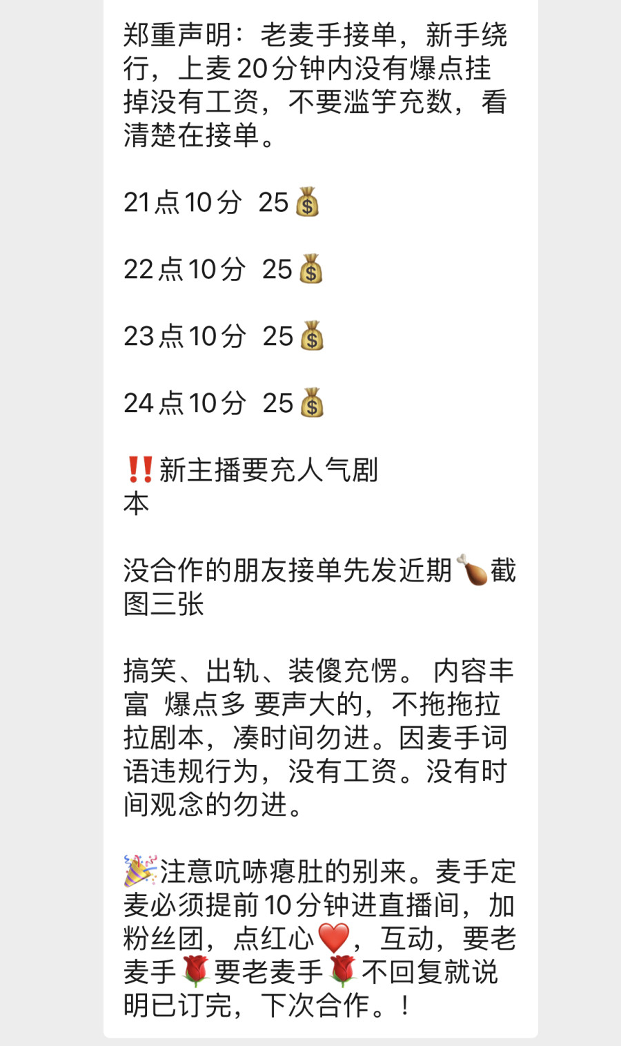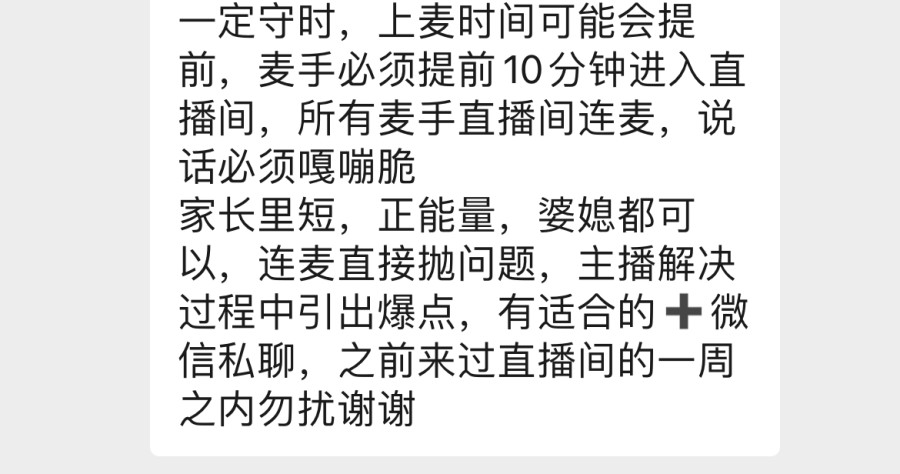 记者发现,网上有不少情感主播与麦手沟通的群,还有供麦手接单的小程序。招麦手的信息一般会说明时间、价格,通常还要求口音、经验、内容等。通常情况下,有丰富经验的老麦手较受欢迎。据上述业内人士介绍,达成初步合作意向后,主播会先审核剧本大纲。直播前,主播还会联系麦手对戏,大概走一遍直播流程,以免出意外。如果是互怼的戏或者是出轨激情的戏,还要商量好尺度,免得影响直播效果或被封号。