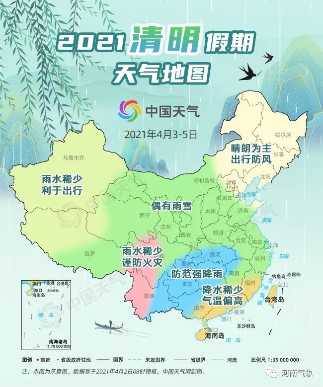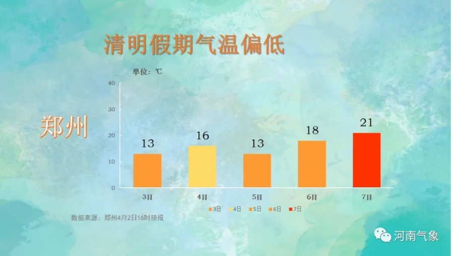 省气象台预报显示:今年清明假期期间(3-5日)河南省多阴雨天气,其中3日、5日全省大部有小雨或零星小雨,气温较常年同期明显偏低,最高气温12~15℃,最低气温3~7℃。3日全省风力较大,公众踏青、祭祀时需加强用火管控,避免发生火灾事故。