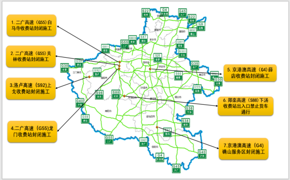 2.二广高速(G55)关林收费站封闭施工,您可以选择瀍河收费站上下站(施工时间:2020年5月20日-2021年3月31日)