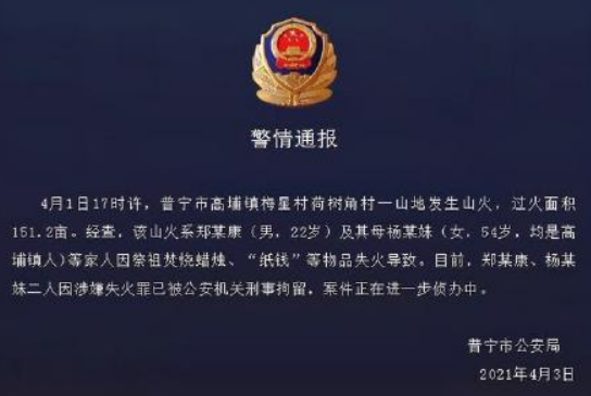 普宁市公安局4月3日在其微信公众号上通报,4月1日17时许,普宁市高埔镇梅星村荷树角村一山地发生山火,过火面积151.2亩。经查,该山火系郑某康(男,22岁)及其母杨某妹(女,54岁,均是高埔镇人)等家人因祭祖焚烧蜡烛、“纸钱”等物品失火导致。目前,郑某康、杨某妹二人因涉嫌失火罪已被公安机关刑事拘留,案件正在进一步侦办中。
