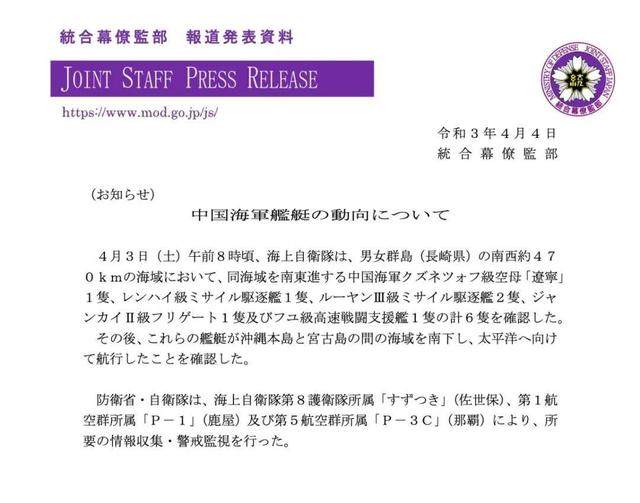 据环球网援引日本防卫省统合幕僚监部周日(4月4日)通报,日本海上自卫队于周六(4月3日)上午8时左右,在日本长崎县男女群岛西南方向470公里海域处,发现包括辽宁舰在内的6艘中国人民解放军海军军舰,日本自卫队的“御用摄影师”还跟拍下了中国航母编队乘风破浪的英姿。
