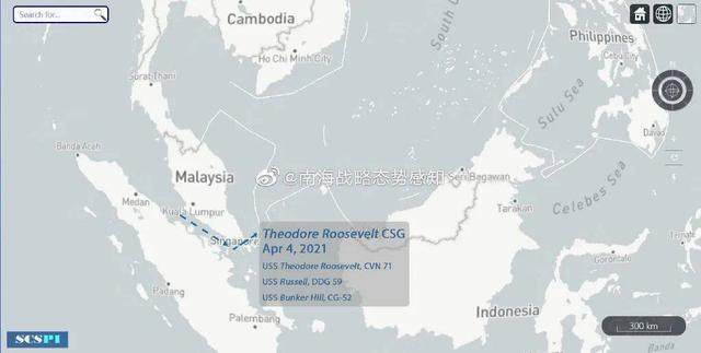 此外,据中国智库“南海战略态势感知”通报,根据AIS信号(自动辨识系统)显示,4月4日上午8时许,美海军“罗斯福”号航母打击群——“罗斯福”号航母、“拉塞尔”号驱逐舰、“邦克山”号巡洋舰——经由马六甲海峡进入南海活动。这是罗斯福号本年度第三次进入南海活动。