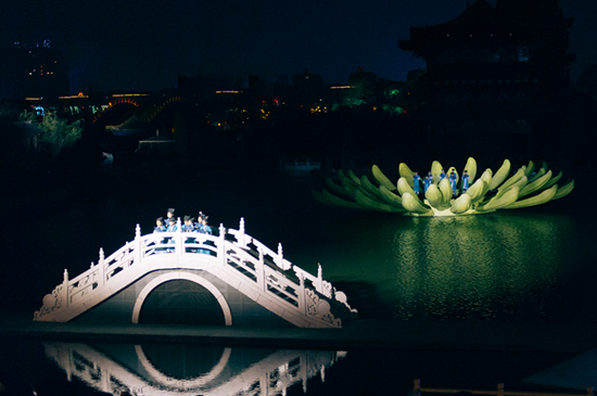 大秀开场,第六代磬乐器郑州市级非遗传承人王宗美老师击磬三下,为大秀拉开帷幕,菊花船乘水而出,30余名少年孩童演员手持古籍大声诵读三字经,作为黄河流域炎黄子孙一脉相承,以礼叙事,将黄河文化融入血脉当中,与数千年前的黄河起始文明遥相呼应。