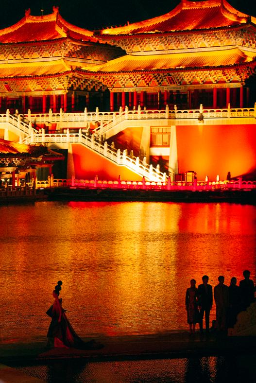具备时尚高度的刺绣制式华服在清明上河园的宋代风格建筑映衬下格外明艳,仿佛是古乐悠扬与艺术歌剧的完美交响。