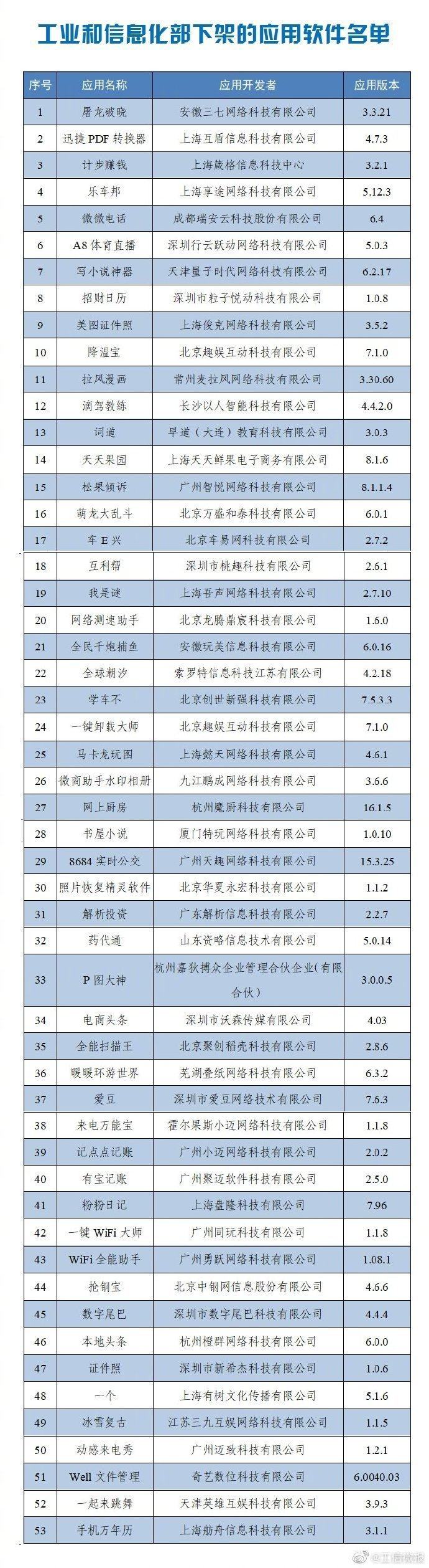 依据《网络安全法》和《移动智能终端应用软件预置和分发管理暂行规定》(工信部信管〔2016〕407号)等法律和规范性文件要求,工信部组织对上述60款APP进行下架。相关应用商店应在本通报发布后,立即组织对名单中应用软件进行下架处理。